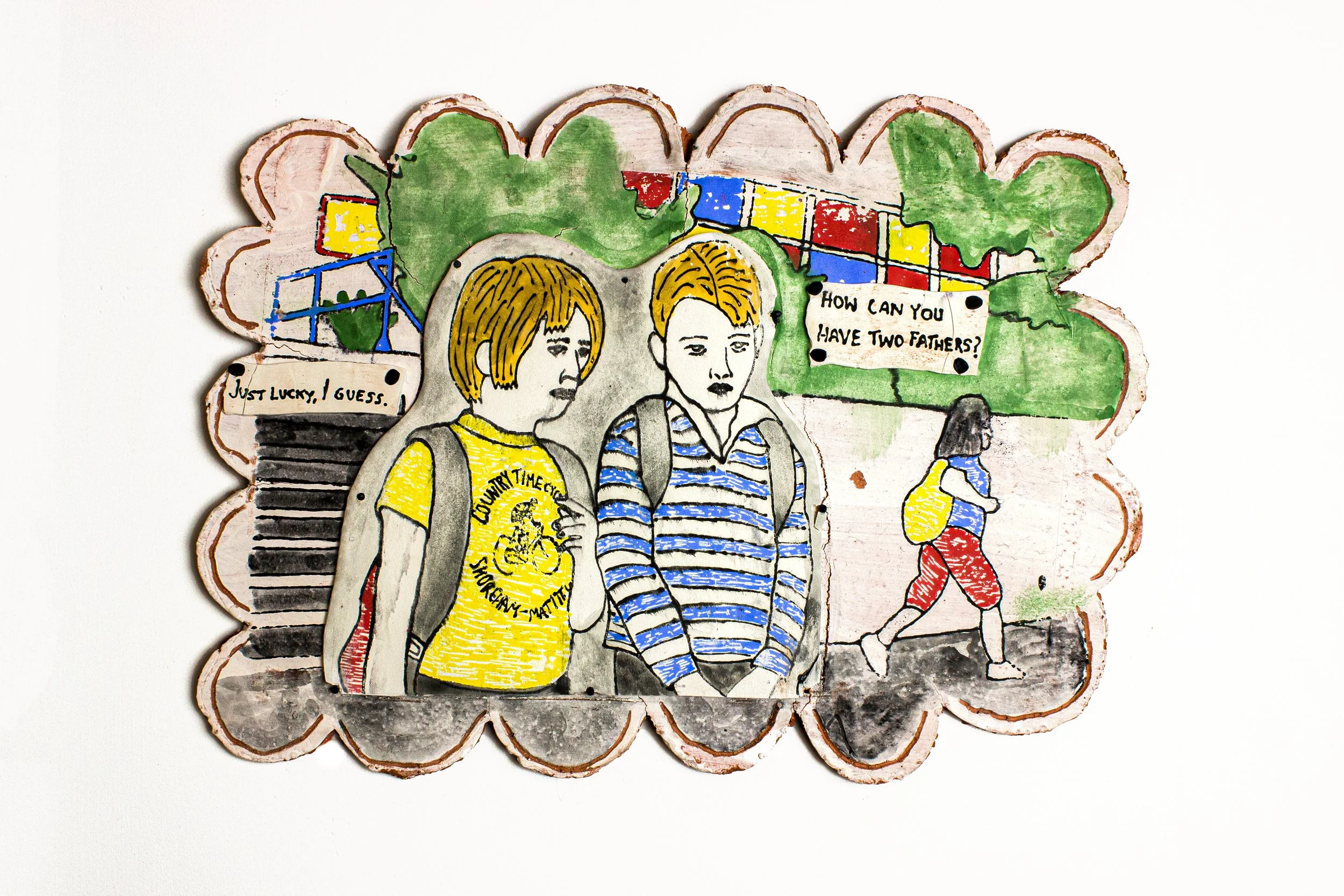The bulk of the content of my work comes from my personal life experience. I often hold a mirror to popular culture as I examine my life and discover that film is magic, and life as it is on screen is unattainable. As I watched Paris, Texas (1984, dir. Wim Wenders) for the first time, a neo-western about the arrival of a no-longer-missing father figure back into his child’s life, I started to think about this character who was raised by two fathers. As a child whose parents are divorced, and then remarried, I too have two fathers, too, and grappling with that lesser-than-conventional idea, much as Hunter does, I discover that it is truly wonderful.