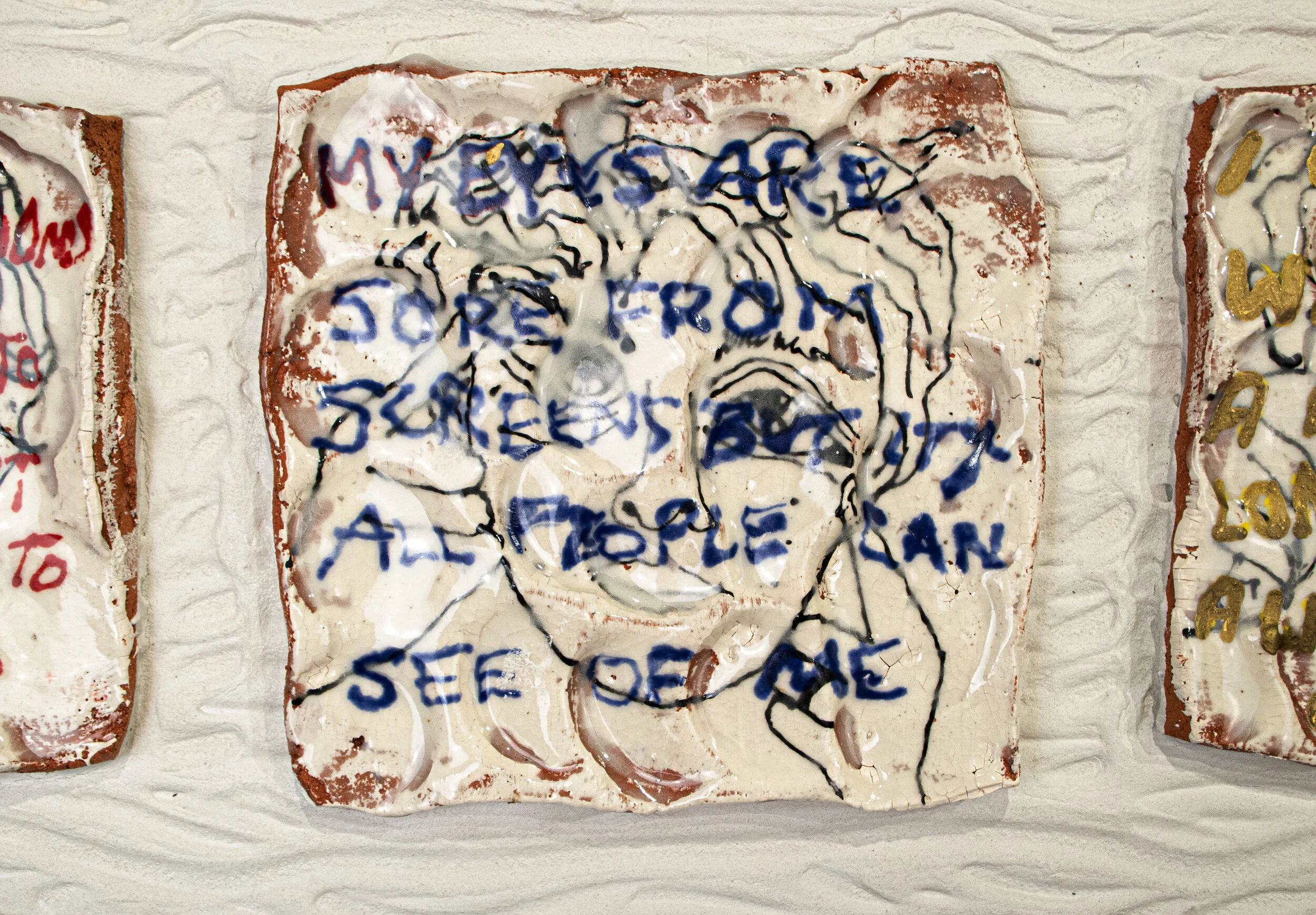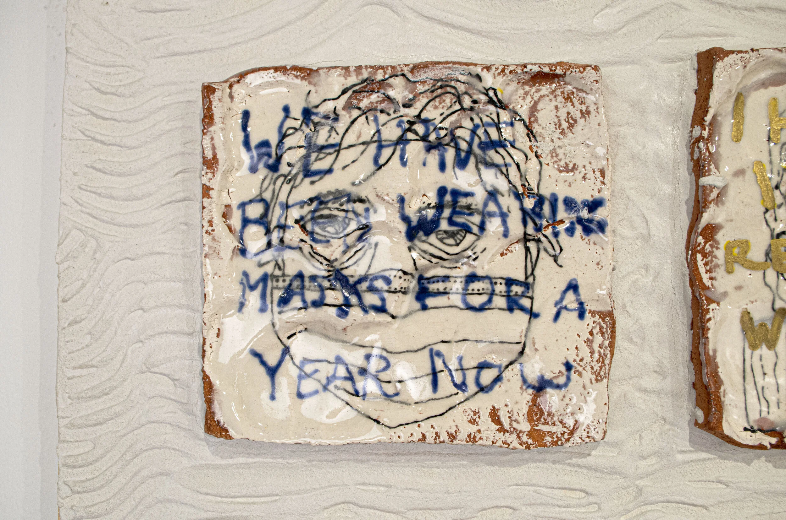 I Will Show You My Face (2021) ceramic tile, glaze, acrylic, bronze powder, plastic chain, and thin-set mortar mounted on plywood